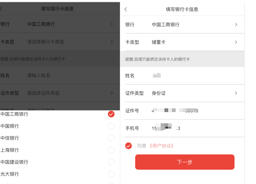 注意:再次添加新银行卡,只能绑定第一张银行卡持卡人本人信息的银行卡!!!注意:汇聚那边暂不支持招商银行。